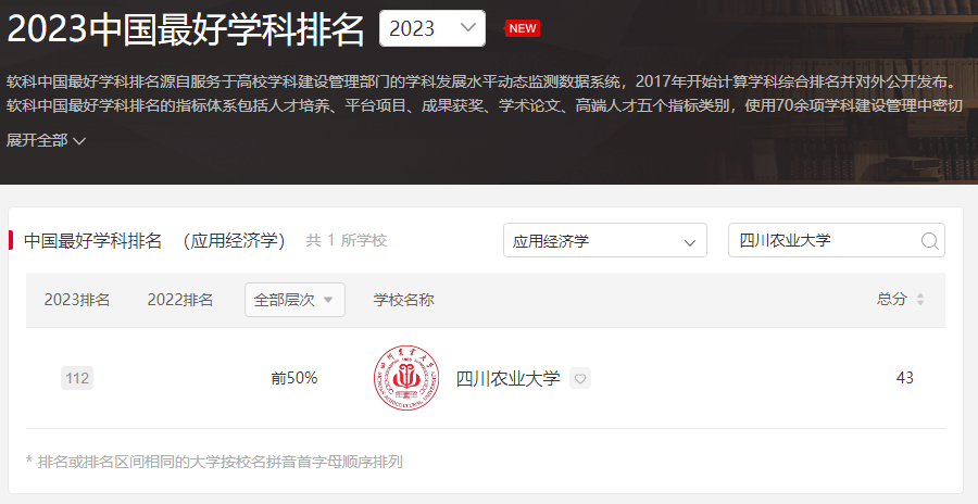 根据最新发布的2023软科中国最好学科排名,新葡的京官网“应用经济学”学科首次上榜,排名112位,进入排名前50%,在农林高校中排名第4。