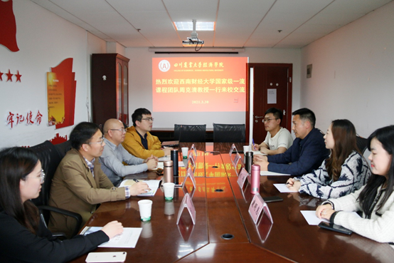 3月30日,西南财经大学财税学院国家级一流课程团队负责人周克清教授一行应邀来我校交流,双方就一流课程建设、课程思政等专题进行深入探讨。350vip8888新葡的京集团吴平副院长,金融学系专业主任刘艳副教授,以及财政与税收课程团队成员参加会议。