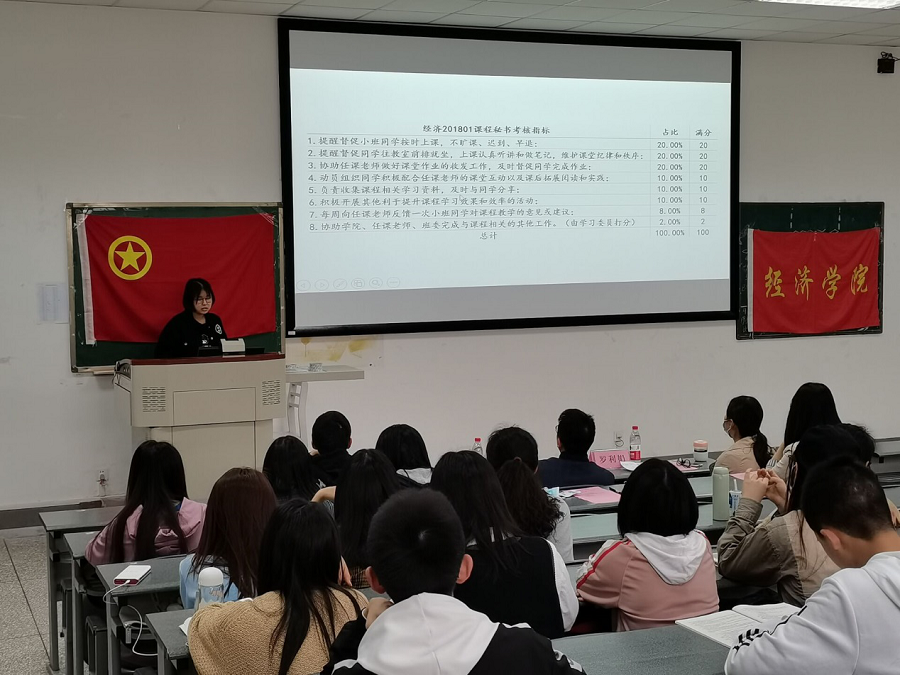 田泽葳担任经济201902班经济法的课程秘书,她认为课程秘书是沟通同学和老师的桥梁,应该起到上传下达的作用。课程秘书要将老师的要求及时有效传达,将同学对课程学习的想法及时的反映给老师。在会上她分享了自己在网课期间任职经验,并表示作为学生课程秘书更能了解班级的学习情况,对问题的看法更贴近同学们的真实想法。