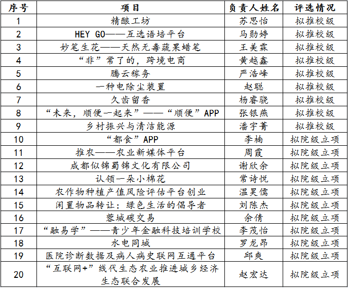 根据国办发〔2015〕36号《国务院办公厅关于深化高等学校创新创业教育改革的实施意见》,经学生申请、答辩,学院教师团队评审、各系推荐、学院审核,评选出以下20支团队,现予以公示。公式时间:2021年4月26日-4月28日上午9:00,公式期间如有异议,请联系350vip8888新葡的京集团团委办公室:028-86291370。